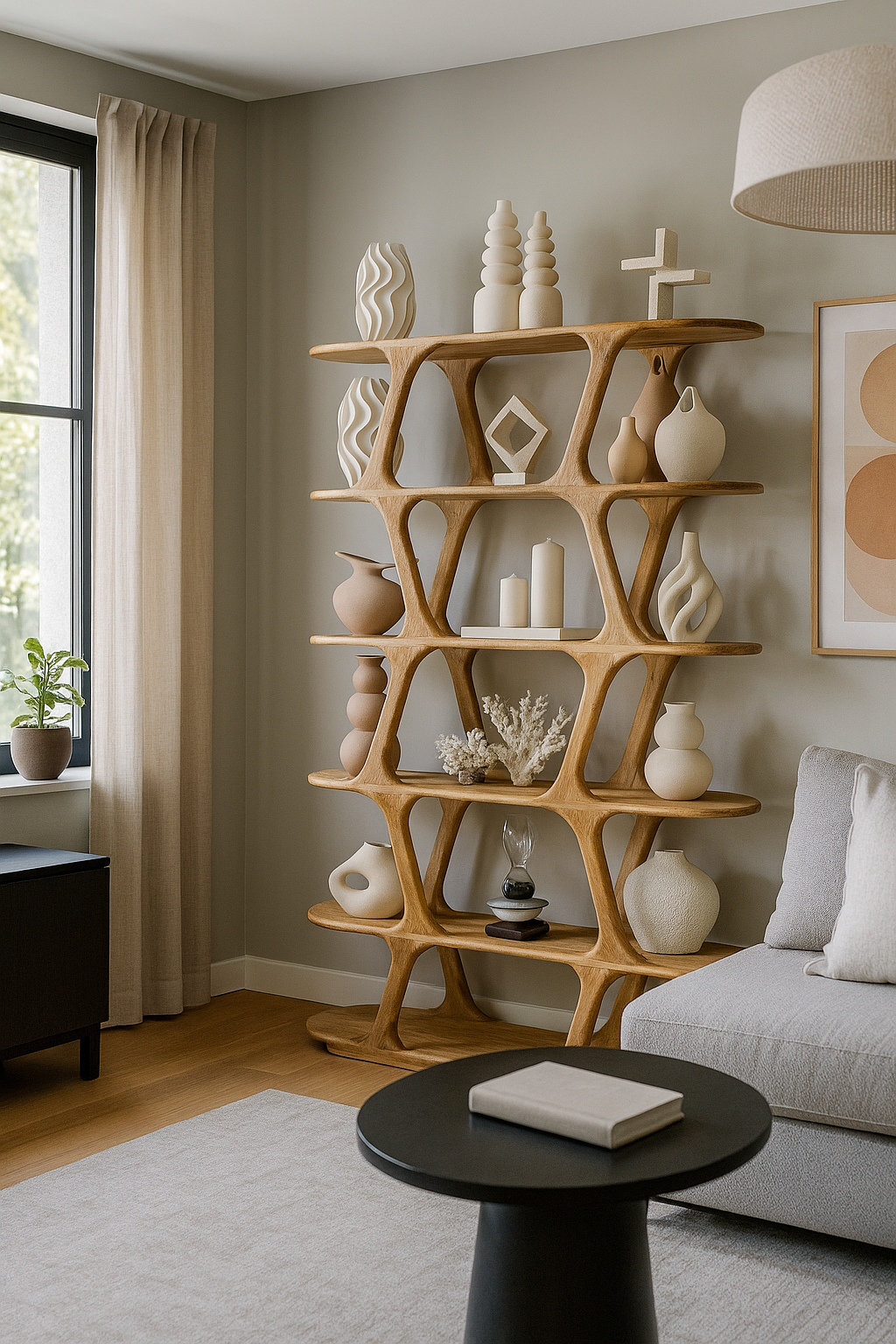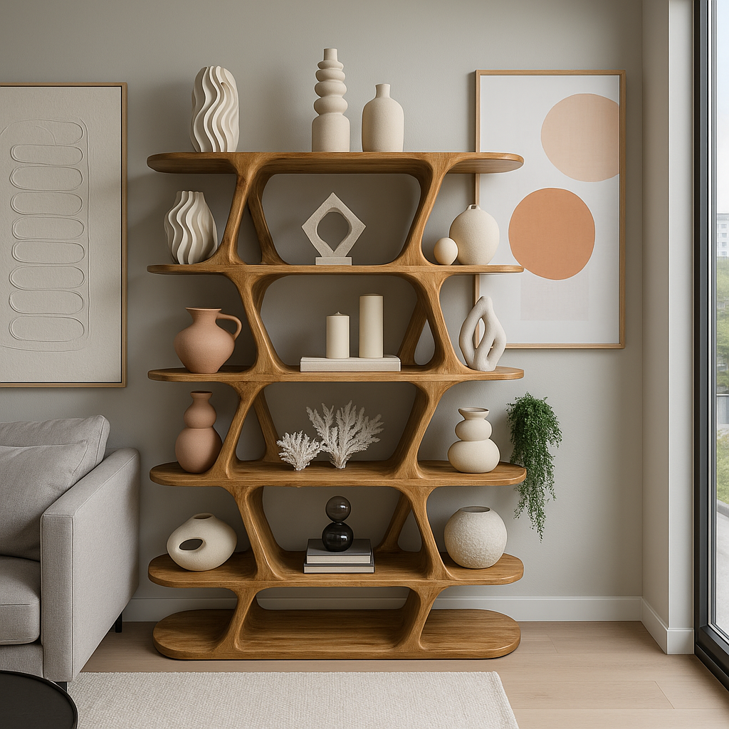 ספרייה מעוררת השראה עשויה עץ מנגו מלא, בעיבוד טבעי המשמר את הגוון החמים והמרקם העדין של העץ. המבנה הגיאומטרי הרך מעניק לה נוכחות פיסולית בחלל, תוך שמירה על קווים הרמוניים וזורמים.