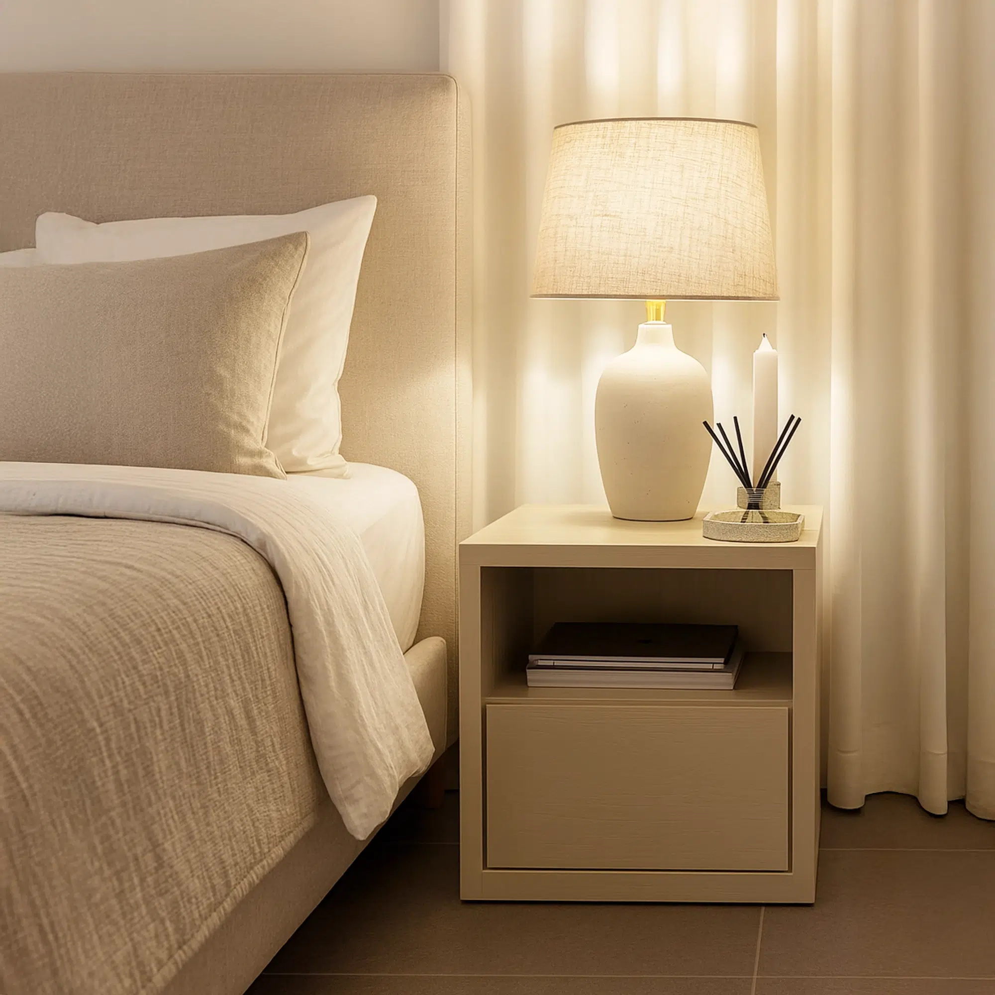 המשטח העליון רחב ויציב, מתאים למנורה, מפיץ ריח ואביזרי דקורציה, ומוסיף לחלל תחושת חמימות ושקט.